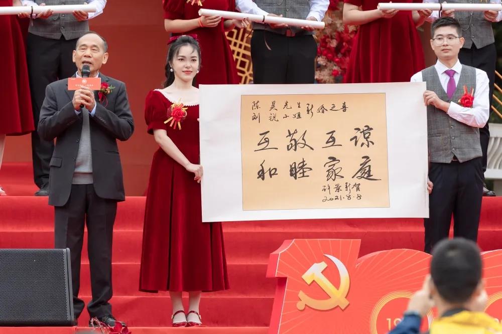 建華控股創(chuàng)始人許景新先生贈(zèng)予新人親手所書(shū)的字畫(huà)“互敬互諒,和睦家庭”,字畫(huà)凝聚了哲學(xué)智慧的夫妻相處之道,值得新人們用心領(lǐng)悟、悉心珍藏,并寄語(yǔ)所有新人要把建華“走正道、負(fù)責(zé)任、心中有別人”的企業(yè)文化落實(shí)在自己的建華小家庭中去。