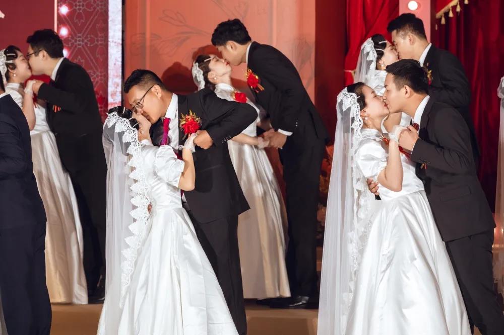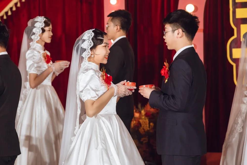 音樂(lè)緩緩響起,燈光漸漸聚焦。在優(yōu)美的旋律中,22對(duì)新人踏著節(jié)拍,伴著輕盈的舞步共同入場(chǎng)。在添喜環(huán)節(jié),新人們共飲甜茶,感受其中甜蜜、滋潤(rùn)的幸福。隨后,新人們四目相對(duì)舉行浪漫擁吻禮,在現(xiàn)場(chǎng)領(lǐng)導(dǎo)、嘉賓的見(jiàn)證下舉行神圣的婚禮儀式