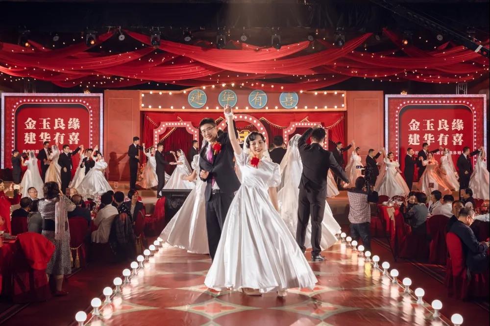 22對(duì)新人在鼓舞飛揚(yáng)的開(kāi)場(chǎng)舞中步入婚禮殿堂,幸福喜悅在每個(gè)人臉上洋溢。